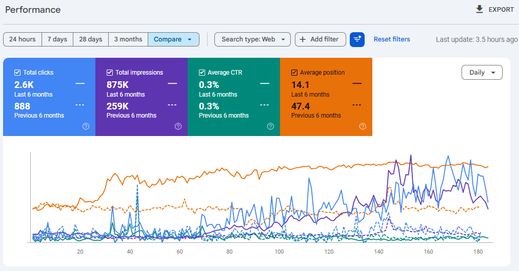 • Low Search Visibility: Average position of 47.4 meant most content appeared on page 5+ of search results